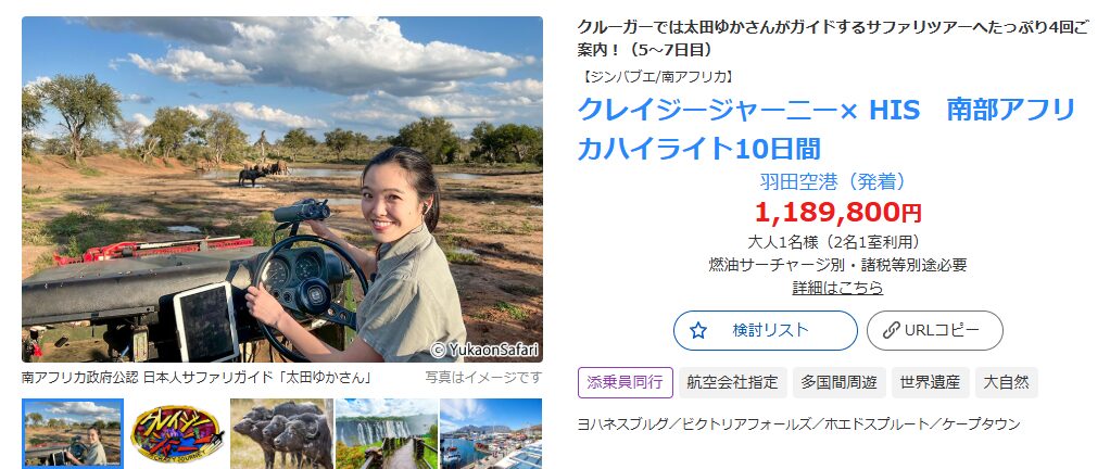 太田ゆかさんがガイドを行っているサファリツアーは、公式サイトやHISなど大手旅行会社の専用プランで体験できます。